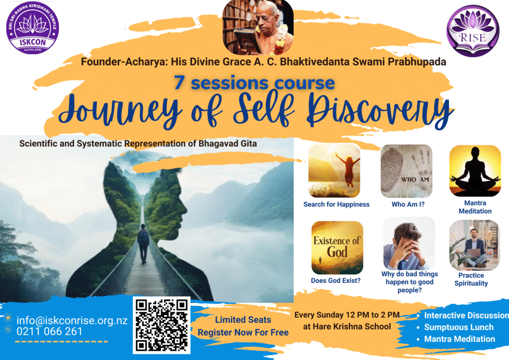 Course Description: “Journey of Self Discovery” is a fun-filled, interactive, thought-provoking Course and absolutely free of charge. People from all walks of life are welcome to join in this journey. In these 8 sessions we explore various concepts of Bhagavad Gita systematically and scientifically, busting many myths and testing the relevance of Vedic wisdom for this digital age.